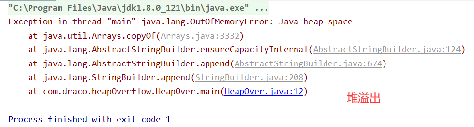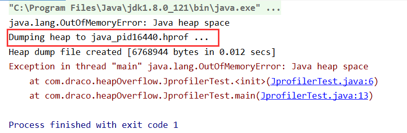 设置VM options -Xms1m -Xmx8m -XX:+HeapDumpOnOutOfMemoryError后,再次运行,控制台输出: