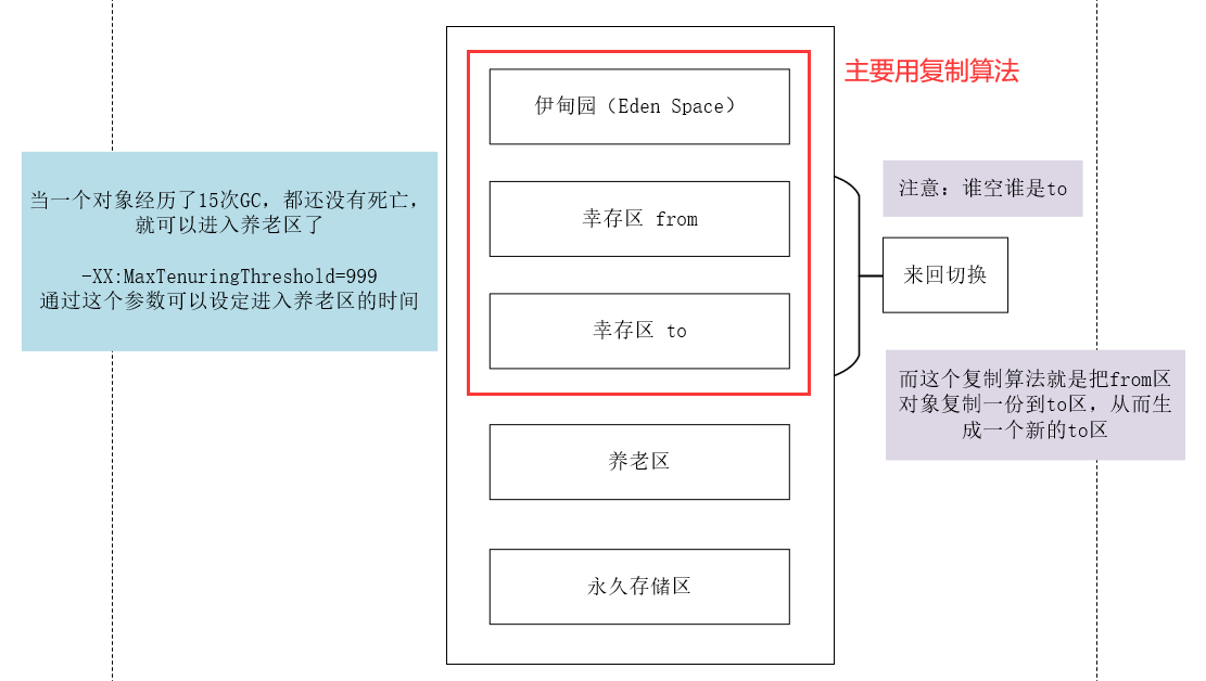 一般新生代(伊甸园区、幸存区)会使用复制算法,生成新的to区