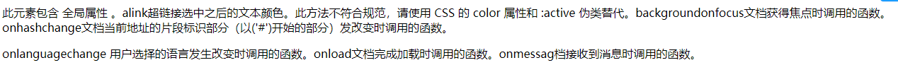 <p>此元素包含 全局属性。<br>超链接选中之后的文本颜色。此方法不符合规范,请使用 CSS 的 color 属性和 :active 伪类替代。backgroundonfocus文档获得焦点时调用的函数。onhashchange文档当前地址的片段标识部分(以('#')开始的部分)发改变时调用的函数。</p>