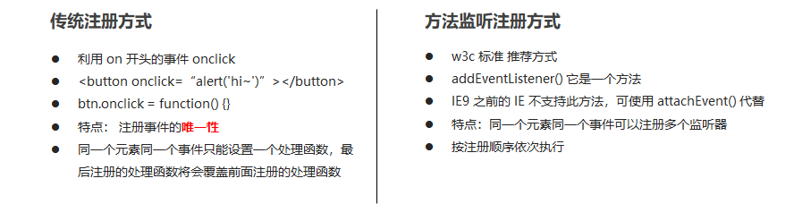 <html lang="en"><head><meta charset="UTF-8"><meta name="viewport" content="width=device-width, initial-scale=1.0"><meta http-equiv="X-UA-Compatible" content="ie=edge"><title>Document</title></head><body><button>传统注册事件</button><button>方法监听注册事件</button><button>ie9 attachEvent</button><script>var btns = document.querySelectorAll('button');// 1. 传统方式注册事件btns[0].onclick = function() {alert('hi');}btns[0].onclick = function() {alert('hao a u');}// 2. 事件侦听注册事件 addEventListener// (1) 里面的事件类型是字符串 必定加引号 而且不带on// (2) 同一个元素 同一个事件可以添加多个侦听器(事件处理程序)btns[1].addEventListener('click', function() {alert(22);})btns[1].addEventListener('click', function() {alert(33);})// 3. attachEvent ie9以前的版本支持btns[2].attachEvent('onclick', function() {alert(11);})</script></body></html> -