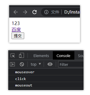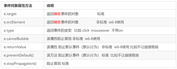 <html lang="en"><head><meta charset="UTF-8"><meta name="viewport" content="width=device-width, initial-scale=1.0"><meta http-equiv="X-UA-Compatible" content="ie=edge"><title>Document</title><style></style></head><body><div>123</div><a href="http://www.baidu.com">百度</a><form action="http://www.baidu.com"><input type="submit" value="提交" name="sub"></form><script>// 常见事件对象的属性和方法// 1. 返回事件类型var div = document.querySelector('div');div.addEventListener('click', fn);div.addEventListener('mouseover', fn);div.addEventListener('mouseout', fn);function fn(e) {console.log(e.type);}// 2. 阻止默认行为(事件) 让链接不跳转 或者让提交按钮不提交var a = document.querySelector('a');a.addEventListener('click', function(e) {e.preventDefault(); // dom 标准写法})// 3. 传统的注册方式a.onclick = function(e) {// 普通浏览器 e.preventDefault(); 方法// e.preventDefault();// 低版本浏览器 ie678 returnValue 属性// e.returnValue;// 我们可以利用return false 也能阻止默认行为 没有兼容性问题 特点: return 后面的代码不执行了, 而且只限于传统的注册方式return false;alert(11);}</script></body></html>![]()