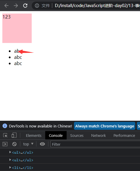 <html lang="en"><head><meta charset="UTF-8"><meta name="viewport" content="width=device-width, initial-scale=1.0"><meta http-equiv="X-UA-Compatible" content="ie=edge"><title>Document</title><style>div {width: 100px;height: 100px;background-color: pink;}</style></head><body><div>123</div><ul><li>abc</li><li>abc</li><li>abc</li></ul><script>// 常见事件对象的属性和方法// 1. e.target 返回的是触发事件的对象(元素) this 返回的是绑定事件的对象(元素)// 区别 : e.target 点击了那个元素,就返回那个元素 this 那个元素绑定了这个点击事件,那么就返回谁var div = document.querySelector('div');div.addEventListener('click', function(e) {console.log(e.target);console.log(this);})var ul = document.querySelector('ul');ul.addEventListener('click', function(e) {// 我们给ul 绑定了事件 那么this 就指向ulconsole.log(this);console.log(e.currentTarget);// e.target 指向我们点击的那个对象 谁触发了这个事件 我们点击的是li e.target 指向的就是liconsole.log(e.target);})// 了解兼容性// div.onclick = function(e) {// e = e || window.event;// var target = e.target || e.srcElement;// console.log(target);// }// 2. 了解 跟 this 有个非常相似的属性 currentTarget ie678不认识</script></body></html>![]()