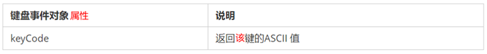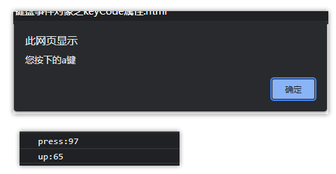 <html lang="en"><head><meta charset="UTF-8"><meta name="viewport" content="width=device-width, initial-scale=1.0"><meta http-equiv="X-UA-Compatible" content="ie=edge"><title>Document</title></head><body><script>// 键盘事件对象中的keyCode属性可以得到相应键的ASCII码值// 1. 我们的keyup 和keydown事件不区分字母大小写 a 和 A 得到的都是65// 2. 我们的keypress 事件 区分字母大小写 a 97 和 A 得到的是65document.addEventListener('keyup', function(e) {// console.log(e);console.log('up:' + e.keyCode);// 我们可以利用keycode返回的ASCII码值来判断用户按下了那个键if (e.keyCode === 65) {alert('您按下的a键');} else {alert('您没有按下a键')}})document.addEventListener('keypress', function(e) {// console.log(e);console.log('press:' + e.keyCode);})</script></body></html>![]()