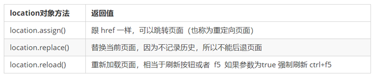 <html lang="en"><head><meta charset="UTF-8"><meta name="viewport" content="width=device-width, initial-scale=1.0"><meta http-equiv="X-UA-Compatible" content="ie=edge"><title>Document</title></head><body><button>点击</button><script>var btn = document.querySelector('button');btn.addEventListener('click', function() {// 记录浏览历史,所以可以实现后退功能// location.assign('http://www.itcast.cn');// 不记录浏览历史,所以不可以实现后退功能// location.replace('http://www.itcast.cn');location.reload(true);})</script></body></html>
