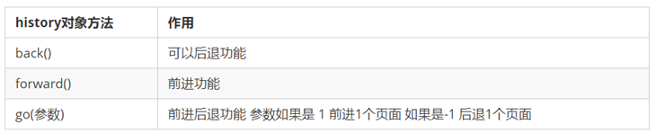 index.html<html lang="en"><head><meta charset="UTF-8"><meta name="viewport" content="width=device-width, initial-scale=1.0"><meta http-equiv="X-UA-Compatible" content="ie=edge"><title>Document</title></head><body><a href="list.html">点击我去往列表页</a><button>前进</button><script>var btn = document.querySelector('button');btn.addEventListener('click', function() {// history.forward();history.go(1);})</script></body></html>list.html<html lang="en"><head><meta charset="UTF-8"><meta name="viewport" content="width=device-width, initial-scale=1.0"><meta http-equiv="X-UA-Compatible" content="ie=edge"><title>Document</title></head><body><a href="index.html">点击我去往首页</a><button>后退</button><script>var btn = document.querySelector('button');btn.addEventListener('click', function() {// history.back();history.go(-1);})</script></body></html> -