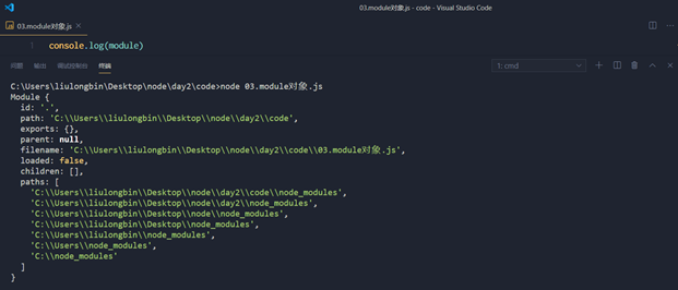 在每个 .js 自定义模块中都有一个 module 对象,它里面存储了和当前模块有关的信息,打印如下: