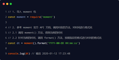 ①使用 npm 包管理工具,在项目中安装格式化时间的包 moment