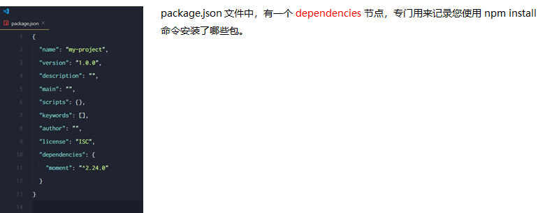 与之对应的,如果某些包在开发和项目上线之后都需要用到,则建议把这些包记录到 dependencies 节点中。