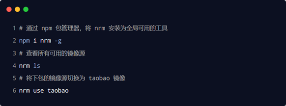 为了更方便的切换下包的镜像源,我们可以安装 nrm 这个小工具,利用 nrm 提供的终端命令,可以快速查看和切换下包的镜像源。