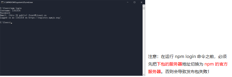 npm 账号注册完成后,可以在终端中执行 npm login 命令,依次输入用户名、密码、邮箱后,即可登录成功。