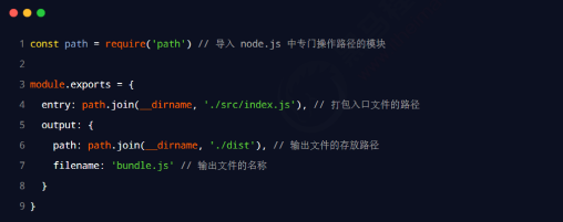 在 webpack.config.js 配置文件中,通过 entry 节点指定打包的入口。通过 output 节点指定打包的出口。 示例代码如下: