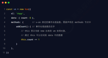 通过 v-on 绑定的事件处理函数,需要在 methods 节点中进行声明: