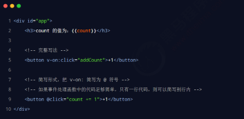 由于 v-on 指令在开发中使用频率非常高,因此,vue 官方为其提供了简写形式(简写为英文的 @ )