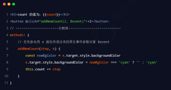 在原生的 DOM 事件绑定中,可以在事件处理函数的形参处,接收事件参数对象 event。同理,在 v-on 指令 (简写为 @ )所绑定的事件处理函数中,同样可以接收到事件参数对象 event,示例代码如下: