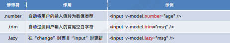 为了方便对用户输入的内容进行处理,vue 为 v-model 指令提供了 3 个修饰符,分别是: