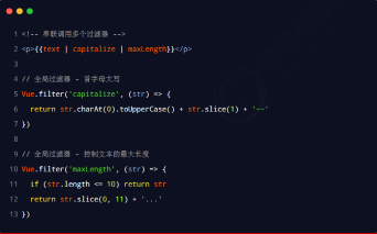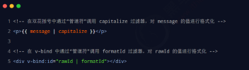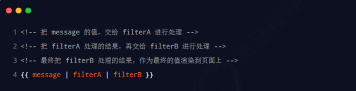 过滤器应该被添加在 JavaScript 表达式的尾部,由“管道符”进行调用,示例代码如下: