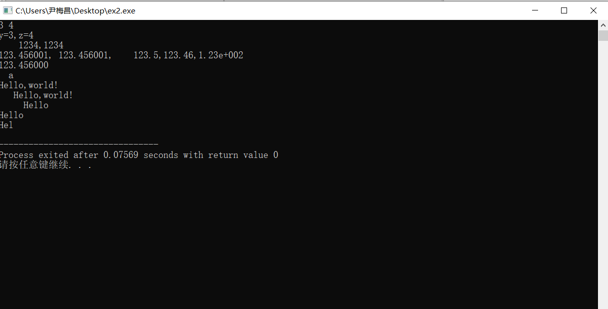 //ex2.cpp #include<stdio.h> int main(){ int x = 1234; float f=123.456; double m=123.456; char ch='a'; char a[]="Hello,world!";//定义一个数组a,数组中存放字符串常量hello,world! int y=3, z=4; printf("%d %d\n",y, z); printf("y=%d,z=%d\n",y,z); printf("%8d,%2d\n",x,x); printf("%f, %8f, %8.1f,%0.2f,%.2e\n",f,f,f,f,f); printf("%lf\n",m); printf("%3c\n",ch); printf("%s\n%15s\n%10.5s\n%2.5s\n%.3s\n",a,a,a,a,a); return 0; }
