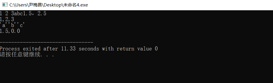 # include<stdio.h> int main(){ double x,y; char c1,c2,c3; int a1,a2,a3; scanf("%d%d%d",&a1,&a2,&a3); printf("%d,%d,%d\n",a1,a2,a3); scanf("%c%c%c",&c1,&c2,&c3); printf("\'%c\'\'%c\'\'%c\'\n",c1,c2,c3); scanf("%lf,%lf",&x,&y); printf("%.1lf,%.1lf\n",x,y); return 0; }