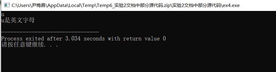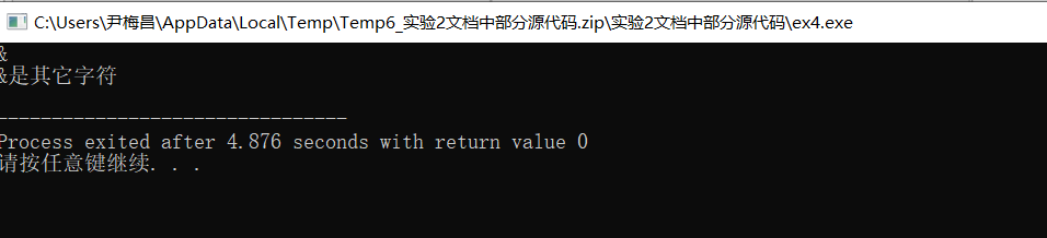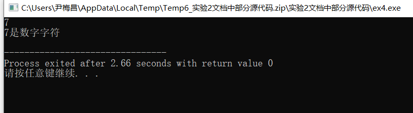 // ex4.cpp // 判断字符类型 #include <stdio.h> int main() { char x; x = getchar(); if( x>=48 && x<=57) // 判断x是数字字符表达式 printf("%c是数字字符\n", x); else if((x>=65 && x<=90)||(x>=97 && x<=122)) // 判断x是大写或小写英文字母的表达式 printf("%c是英文字母\n", x); else printf("%c是其它字符\n", x); return 0; }