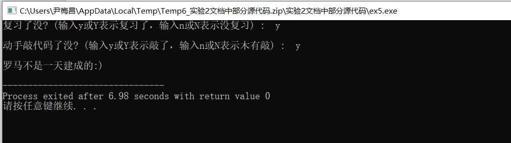 // ex5.cpp #include <stdio.h> int main() { char ans1, ans2; printf("复习了没? (输入y或Y表示复习了,输入n或N表示没复习) : "); ans1 = getchar(); // 从键盘输入一个字符,赋值给ans1 getchar(); // 思考这里为什么要加这一行 printf("\n动手敲代码了没? (输入y或Y表示敲了,输入n或N表示木有敲) : "); ans2 = getchar(); if((ans1&&ans2)==("y"||"Y")) printf("\n罗马不是一天建成的:)\n"); else printf("\n罗马不是一天毁灭的。。。\n"); return 0; }