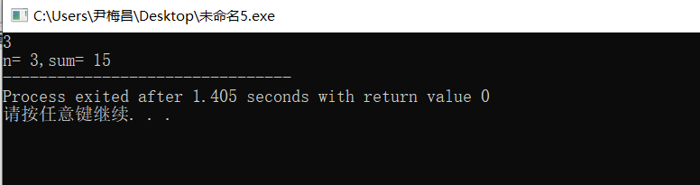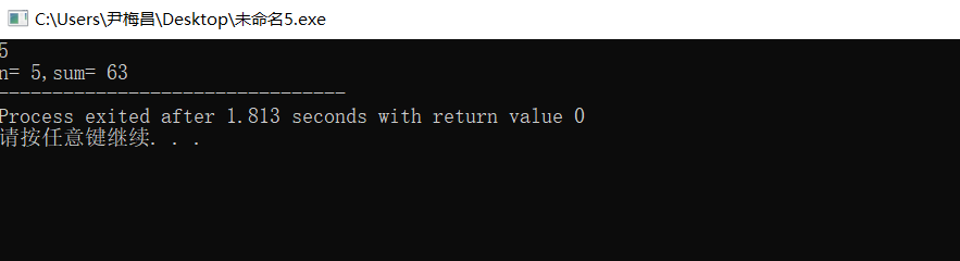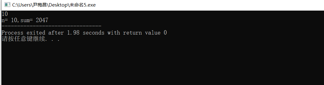 #include <stdio.h> #include <math.h> int main(){ int n,sum; scanf("%d",&n); sum=(1*(1-pow(2,n+1))/(1-2)); printf("n= %d,sum= %d",n,sum); return 0; }