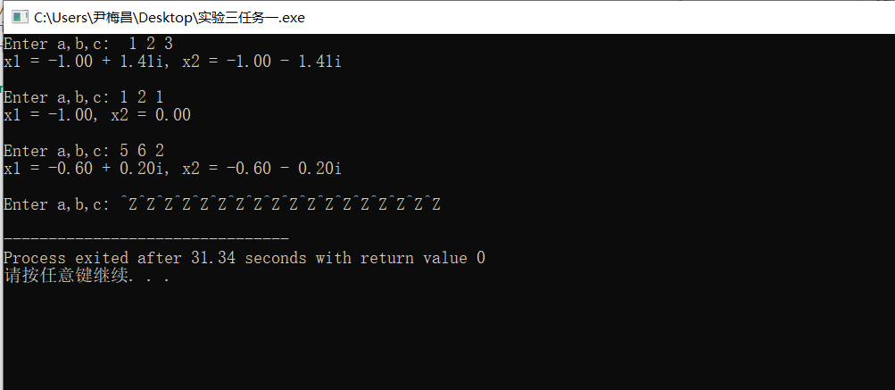//一元二次方程求解 //重复执行,直到Ctrl+Z结束 // #include<math.h> #include<stdio.h> int main(){ float a,b,c,x1,x2; float delta,real,imag; printf("Enter a,b,c: "); while(scanf("%f%f%f", &a, &b, &c) != EOF) { if(a == 0) printf("not quadratic equation.\n\n"); else{ delta = b*b - 4*a*c; if(delta >=0){ x1 = (-b + sqrt(delta)) / (2*a); x1 = (-b - sqrt(delta)) / (2*a); printf("x1 = %.2f, x2 = %.2f\n\n",x1,x2); } else { real = -b/(2*a); imag = sqrt(-delta) / (2*a); printf("x1 = %.2f + %.2fi, x2 = %.2f - %.2fi\n\n",real,imag,real,imag); } } printf("Enter a,b,c: "); } return 0; }