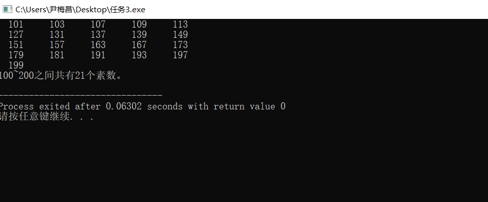 #include<stdio.h> #include<stdlib.h> #include<math.h> int main() { int x,y,z,a; y=101; a=0; z=0; for (;y<=200;y++) { for (x=2;x<=y;x++) { if(y%x==0) { break; } } if(y==x) { printf("%5d\t",y); a++; if (a%5==0) printf("\n"); } } printf("\n100~200之间共有%d个素数。\n",a); return 0; }