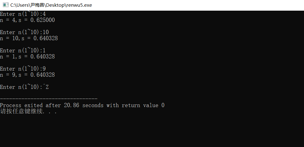 #include<stdio.h> #include<stdlib.h> int main(){ int n,i,p=1; float s=1,l; printf("Enter n(1~10):"); while(scanf("%d",&n)!=EOF){ for(i=2;i<=n;i++){ p=p*i*(-1); l=1.0/p; s=s+l; } printf("n = %d,s = %f",n,s); printf("\n"); printf("\n"); printf("Enter n(1~10):"); } return 0; }