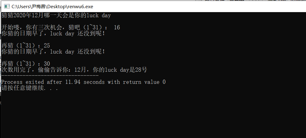 # include<stdio.h> # include<stdlib.h> # include<time.h> #define max 31 #define min 1 int main() { int x=1, n,t; srand(time(0)); n=rand()%((max-min)+min); printf("猜猜2020年12月哪一天会是你的luck day\n"); printf("\n"); printf("开始喽,你有三次机会,猜吧(1~31): "); scanf("%d",&t); while(x<3){ if(n==t){ printf("luck day!"); break; } else if(n>t){ printf("你猜的日期早了,luck day 还没到呢!"); printf("\n"); printf("\n"); x++; printf("再猜(1~31):"); scanf("%d",&t); } else if(n<t){ printf("你猜的日期晚了,luck day 悄悄溜到前面了!"); printf("\n"); printf("\n"); x++; printf("再猜(1~31):"); scanf("%d",&t); } if(x==3) printf("次数用完了,偷偷告诉你:12月,你的luck day是%d号",n); } return 0; }
