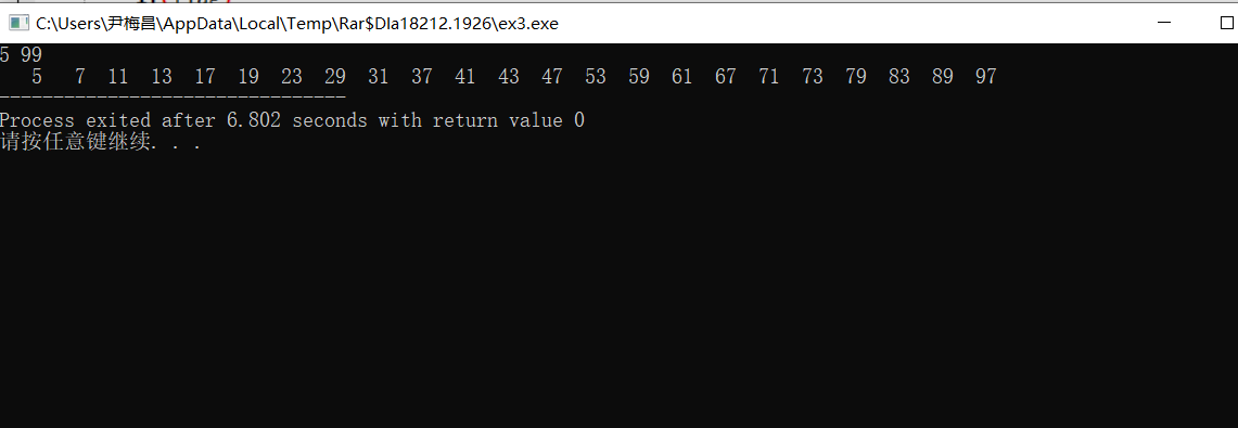 //寻找两个整数之间的所有素数(包括这两个整数),把结果保存在数组bb中,函数返回素数的个数。 // 例如,输入6和21,则输出为:7 11 13 17 19。 #include <stdio.h> #define N 1000 int fun(int n,int m,int bb[N]) { int i,j,k=0,flag; for(j=n;j<=m;j++) { flag=1; for(i=2;i<j;i++) if(j%i==0) { flag=0; break; } if(flag) bb[k++]=j; } return k; } int main(){ int n=0,m=0,i,k,bb[N]; scanf("%d",&n); scanf("%d",&m); for(i=0;i<m-n;i++) bb[i]=0; k=fun(n,m,bb); for(i=0;i<k;i++) printf("%4d",bb[i]); return 0; }