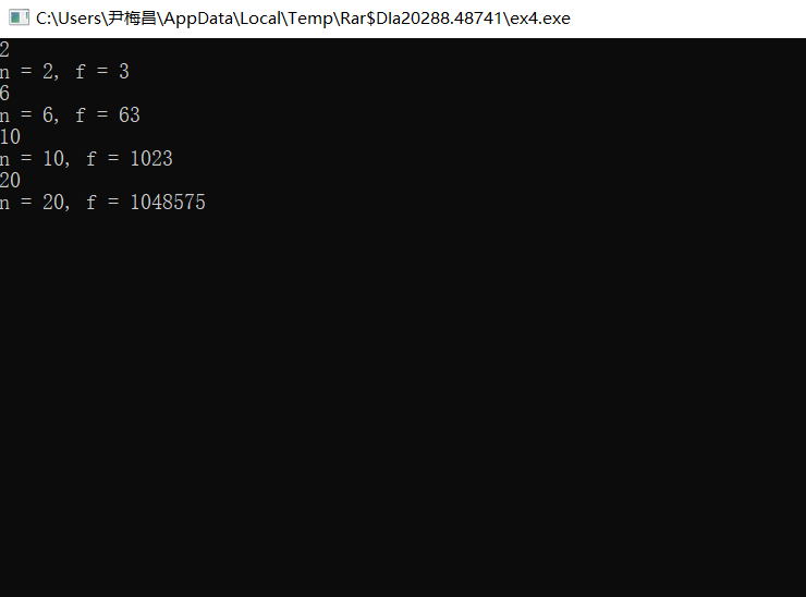 #include <stdio.h> long long fun(int n); // 函数声明 int main() { int n; long long f; while(scanf("%d", &n) != EOF) { f = fun(n); // 函数调用 printf("n = %d, f = %lld\n", n, f); } return 0; } // 函数定义 long long fun(int n){ int i; if(n==0) i=0; else i=(fun(n-1)+1)*2-1; return i; }