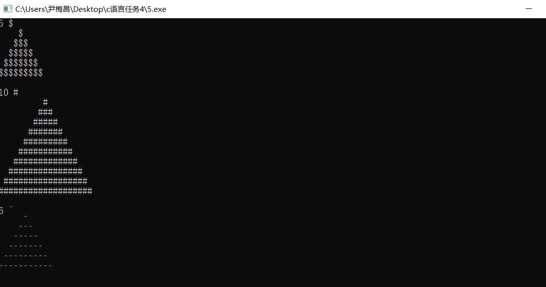 #include <stdio.h> void draw(int n, char symbol); // º¯ÊýÉùÃ÷ #include <stdio.h> int main() { int n, symbol; while(scanf("%d %c", &n, &symbol) != EOF) { draw(n, symbol); // º¯Êýµ÷Óà printf("\n"); } return 0; } // º¯Êý¶¨Òå void draw(int n, char symbol){ int i,line,j; for(line=1;line<=n;line++){ for(i=1;i<=n-line;i++){ printf(" "); } for(j=1;j<=(2*line-1);j++){ printf("%c",symbol); } printf("\n"); } }