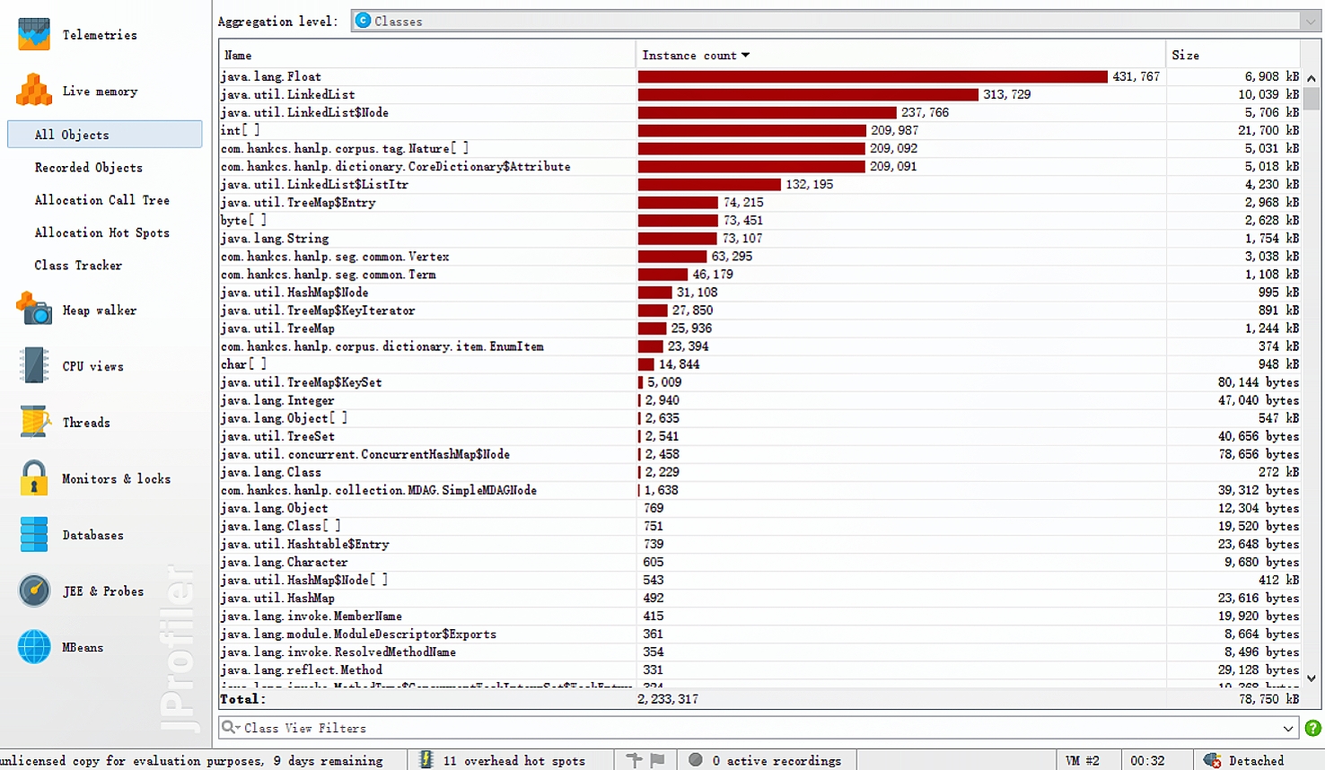 调用次数最多的是com.hankcs.hanlp包提供的接口, 即分词、取关键词与计算词频花费了最多的时间。
