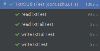 1 public class TxtIOUtilsTest { 2 @Test 3 public void readTxtTest() { 4 // 路径存在,正常读取 5 String str = TxtIOUtils.readTxt("D:/test/orig.txt"); 6 String[] strings = str.split(" "); 7 for (String string : strings) { 8 System.out.println(string); 9 } 10 } 11 @Test 12 public void writeTxtTest() { 13 // 路径存在,正常写入 14 double[] elem = {0.11, 0.22, 0.33, 0.44, 0.55}; 15 for (int i = 0; i < elem.length; i++) { 16 TxtIOUtils.writeTxt(elem[i], "D:/test/ans.txt"); 17 } 18 } 19 @Test 20 public void readTxtFailTest() { 21 // 路径不存在,读取失败 22 String str = TxtIOUtils.readTxt("D:/test/none.txt"); 23 } 24 @Test 25 public void writeTxtFailTest() { 26 // 路径错误,写入失败 27 double[] elem = {0.11, 0.22, 0.33, 0.44, 0.55}; 28 for (int i = 0; i < elem.length; i++) { 29 TxtIOUtils.writeTxt(elem[i], "User:/test/ans.txt"); 30 } 31 } 32 }