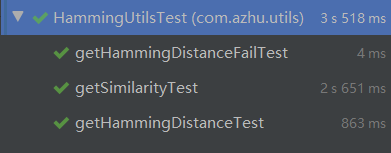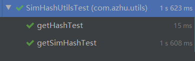 1 public class SimHashUtilsTest { 2 @Test 3 public void getHashTest(){ 4 String[] strings = {"余华", "是", "一位", "真正", "的", "作家"}; 5 for (String string : strings) { 6 String stringHash = SimHashUtils.getHash(string); 7 System.out.println(stringHash.length()); 8 System.out.println(stringHash); 9 } 10 } 11 @Test 12 public void getSimHashTest(){ 13 String str0 = TxtIOUtils.readTxt("D:/test/orig.txt"); 14 String str1 = TxtIOUtils.readTxt("D:/test/orig_0.8_add.txt"); 15 System.out.println(SimHashUtils.getSimHash(str0)); 16 System.out.println(SimHashUtils.getSimHash(str1)); 17 } 18 }