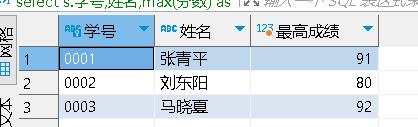 select s.学号,姓名,max(分数) as 最高成绩 from student_info s,grade g where s.学号 = g.学号 GROUP BY s.学号;