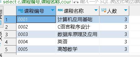 select g.课程编号,课程名称,count(*) 选修人数 from curriculum c right outer join grade g on g.课程编号=c.课程编号 group by g.课程编号;