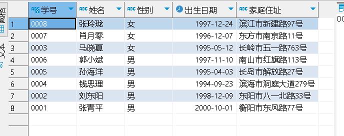 1.对student_info表,查询学生的学号、姓名、性别、出生日期及家庭住址,查询结果先按照性别的由小到大排序,性别相同的再按学号由大到小排序。