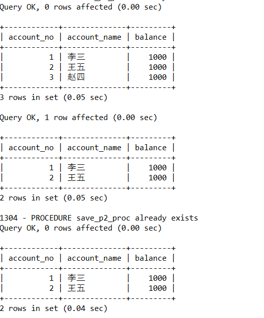 【例6-2】假设银行存在两个借记卡账户(account)李三与‘王五,要求这两个借记卡账户不能用于透支,即两个账户的余额 (balance) 不能小于0。创建存储过程tran procO, 实现两个账户的转账业务。