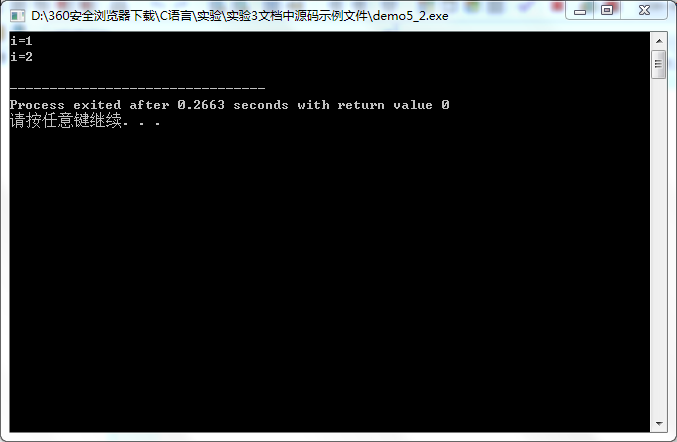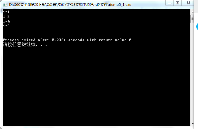 #include <stdio.h> int main() { int i; // 在循环语句中使用break for(i=1; i<=5; i++) { if (i%3 == 0) // 如果i是3的倍数,则结束整个循环 break; printf("i=%d\n",i); } return 0; }