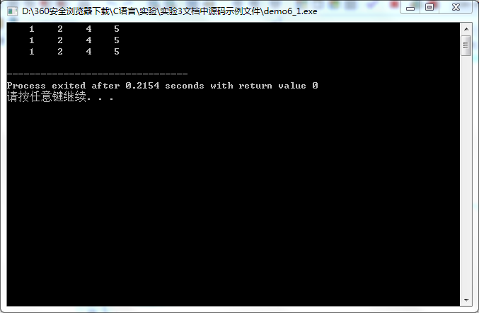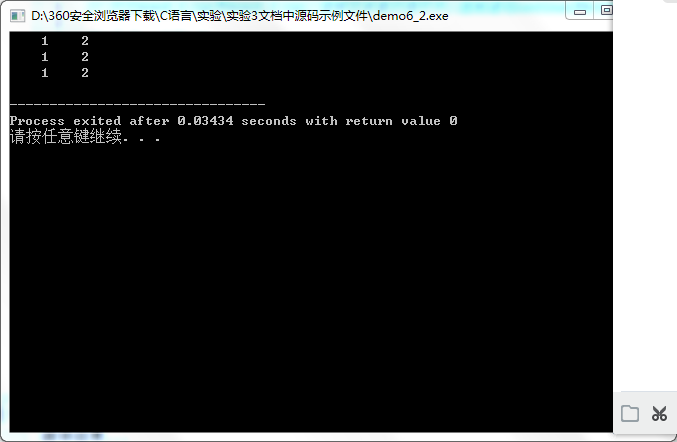 #include <stdio.h> const int LINE=3; // 定义符号常量LINE const int COLUME=5; // 定义符号常量COLUME int main() { int line; // 定义变量line, 用来控制行数 int col; // 定义变量col, 用来控制列数 // 输出LINE行信息 for(line=1; line<=LINE; line++) { // 每一行中,利用循环,输出各列信息 for(col=1; col<=COLUME; col++) { if(col%3 == 0) // 如果col是3的倍数,则结束内层循环体 break; printf("%5d", col); } printf("\n"); // 每输出完一行,换行 } return 0; }