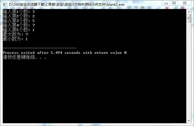 #include <stdio.h> int main() { int number, max, min, n; n=1; printf("输入第%d个数: ", n); scanf("%d", &number); max = number; min = number; while(n < 5) { n++; printf("输入第%d个数: ", n); scanf("%d", &number); if(number > max) max = number; else if(number < min) min = number; } printf("最大数为: %d\n", max); printf("最小数为: %d\n", min); return 0; }