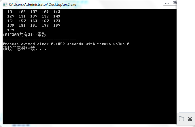 /*编程输出101~200之间的所有素数, 并输出这一区间内的素数个数*/ #include <stdio.h> #include <math.h> #include <stdlib.h> int main(){ int n,m,i,s=0; for(n=101;n<=200;n=n+1){ m=sqrt(n); for(i=2;i<=m;i++) if(n%i==0) break; if(i>m){ printf("%5d",n); s=s+1; if(s%5==0) printf("\n"); } } printf("\n"); printf("101~200共有%d个素数",s); return 0; }