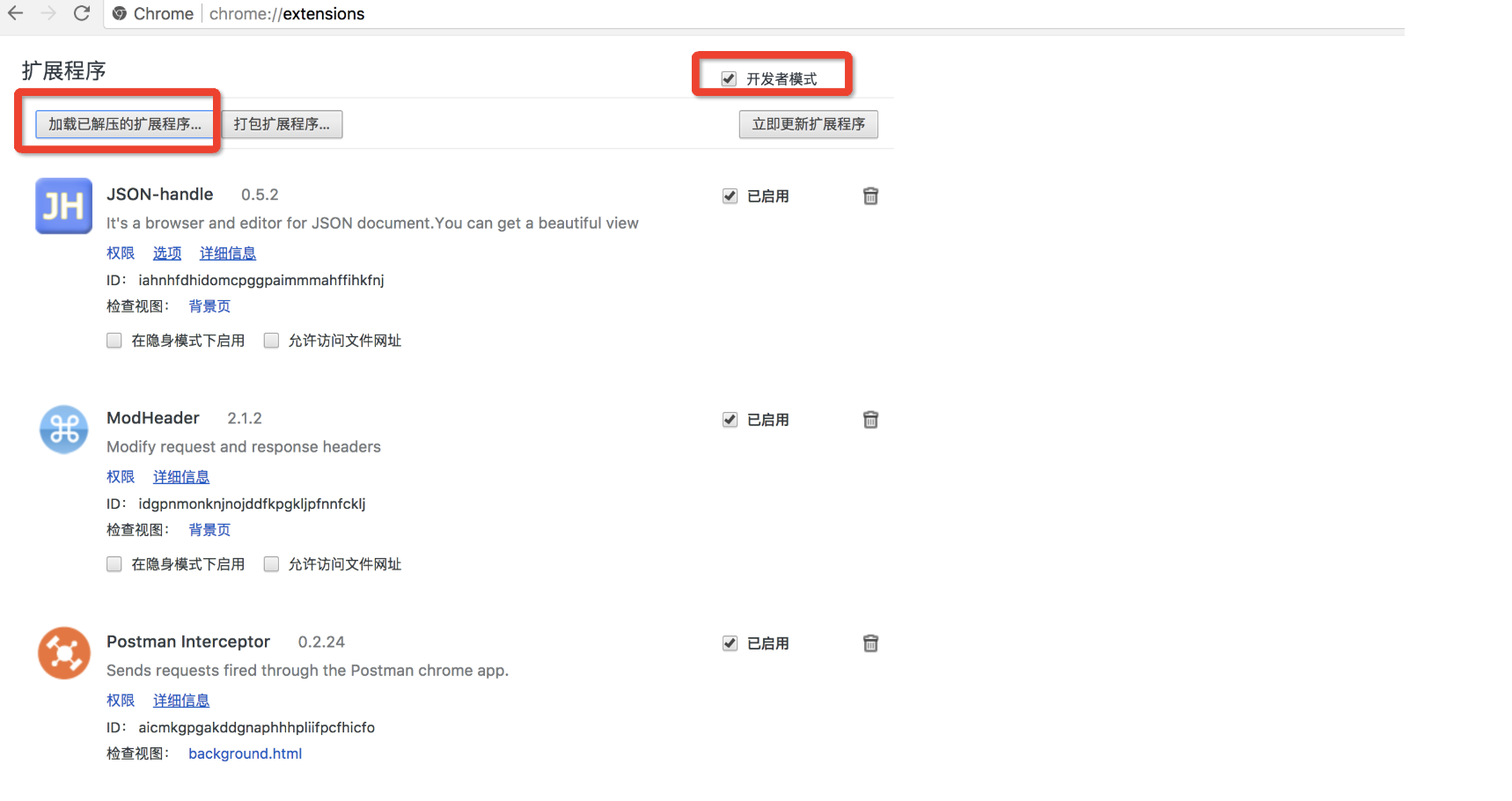 2.打开Chrome扩展程序管理,选中开发者模式,点击加载已解压的扩展程序,然后选择刚刚克隆下来的目录