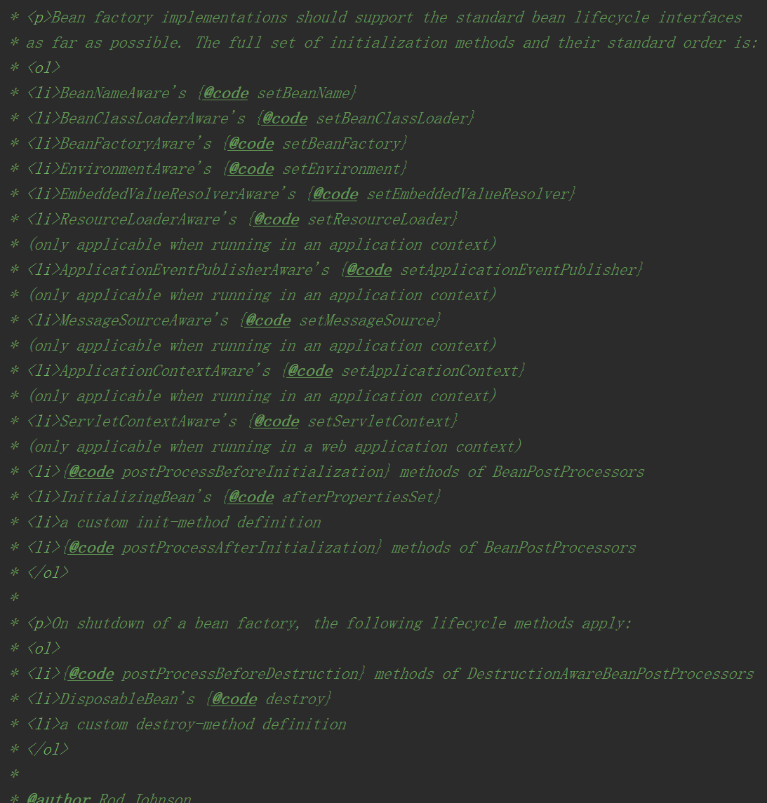 ①如果这个Bean已经实现了BeanNameAware接口,会调用它实现的setBeanName(String beanId)方法,此处传递的就是Spring配置文件中Bean的id值;