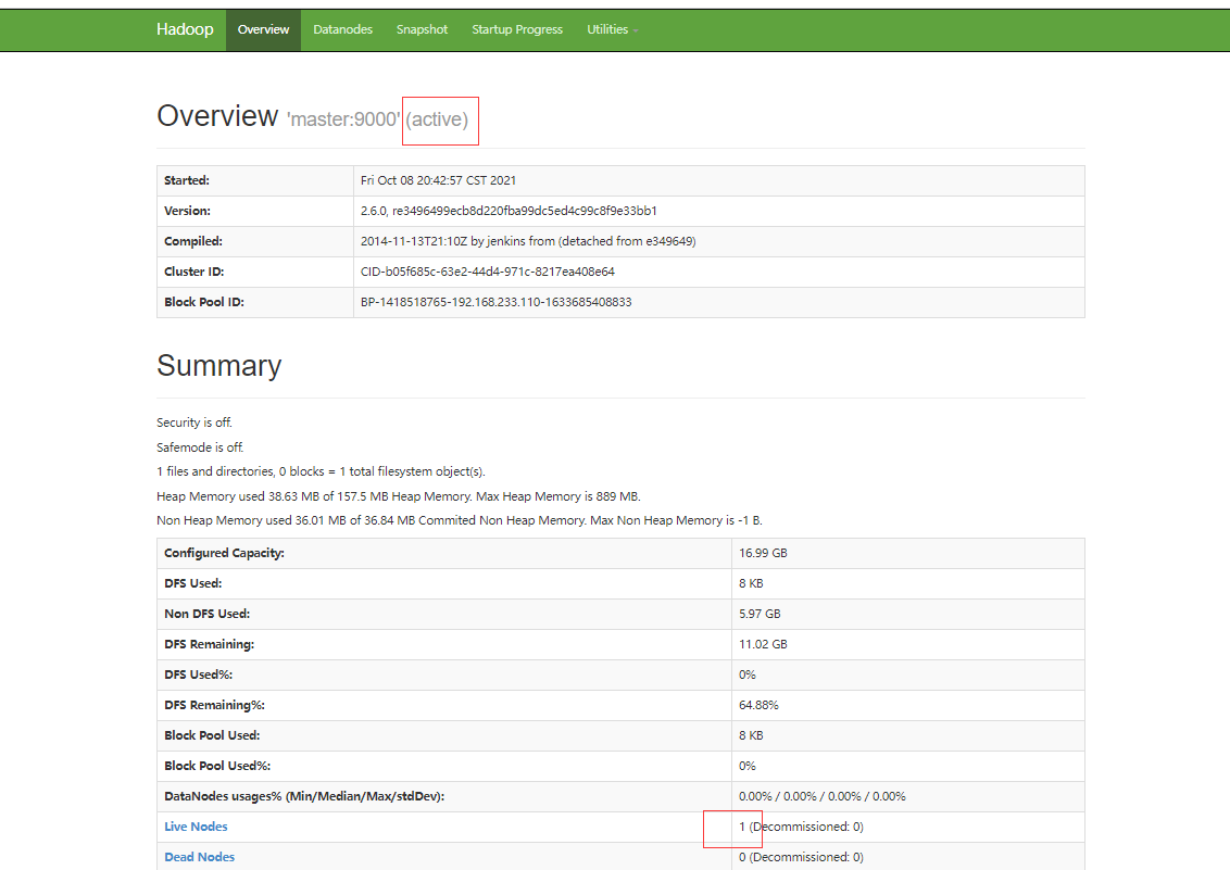 启动hadoop,并前往浏览器查看状况(访问路径:http://192.168.233.110:50070/)