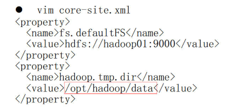 <property> <name>fs.defaultFS</name> <value>hdfs://hadoop01:9000</value> </property> <property> <name>hadoop.tmp.dir</name> <value>/opt/hadoop/data</value> </property> -