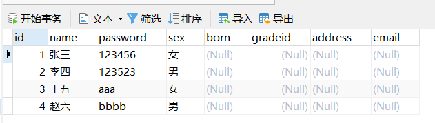 INSERT INTO `student`(`name`) VALUES('张三'); INSERT INTO `student`(`name`,`password`,`sex`) VALUES('李四','123523','男'); INSERT INTO `student`(`name`,`password`,`sex`) VALUES('王五','aaa','女'),('赵六','bbbb','男');![]()