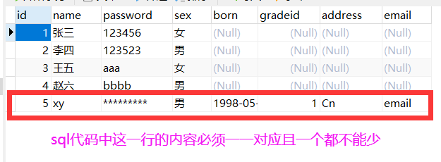 INSERT INTO `student` VALUES(5,'xy','*********','男','1998-05-01',1,'Cn','email');![]()