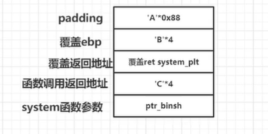 看这个图片,因为是32位,所以参数全部在栈上,所以我们直接把binsh地址放到栈上就行,要注意那"C"*4是把system的ret返回给覆盖,因为system结束是会有个ret的,所以要覆盖一下,这个可以根据情况看是否要覆盖为main函数地址来重新执行一遍函数,然后再放参数binsh的地址就行了